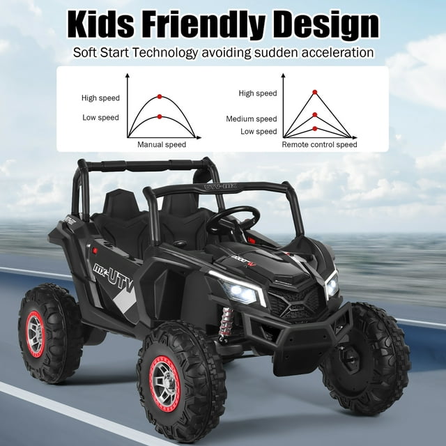 • Spring Suspension Wheels & Slow Start: 4 wheels are equipped with spring suspension to reduce the shock and vibrate during movement. This ride-on UTV is suitable to move on most even and hard surfaces, like tar. The slow start system promises this car toy to navigate smoothly and safely without sudden acceleration or brake.
