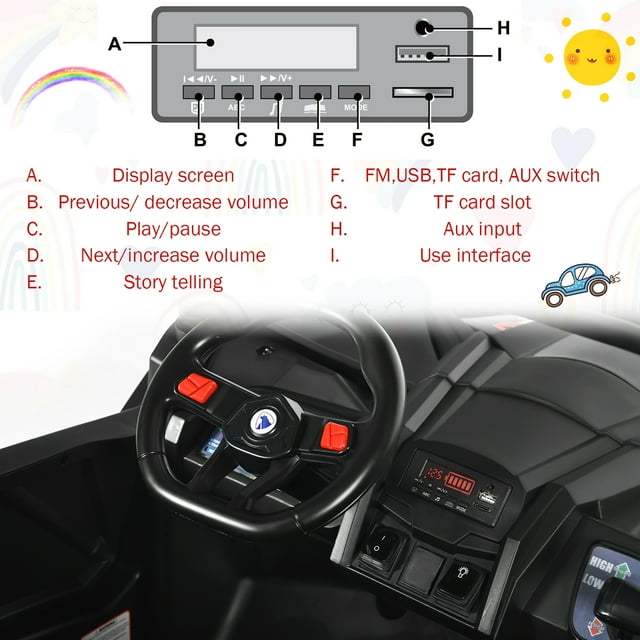 Music, story, FM, TF & USB & AUX socket, reverse & forward stick, lighting dashboards